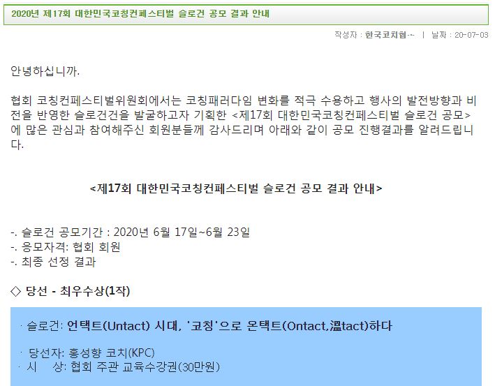 <홍성향 코치 Profile> [오예!] 2020년 제17회 대한민국코칭컨페스티벌 슬로건 공모: 최우수상 당선!! Artistcoach 2020. 7. 3. 17:43 오늘 기쁜 소식을 전해들었습니다. 올해 가을에 잇을 코칭컨페스티벌 슬로건으로, 제가 제출했던 슬로건이 최우수상으로 당선되었다는 소식이요. 오예! 신기하고 신기하네요. 모두가 언택트시대에 온택트 하기를! 공유하기 게시글 관리 ARTIST COACH 저작자표시 비영리 변경금지 (새창열림) '<홍성향 코치 Profile>' Related Articles [공지] 2020년 10/26(월)-12/14(월), 약 50일간 제가 진행하는 모든 1:1라이프코칭 방식을 화상대화에서 이메일코칭으로 전환합니다. 제16회 대한민국 코칭컨페스티벌 (제2회 코칭학술포럼), 우수논문상 수상 및 논문발표를 하게 되었습니다(2019-11-07, 16:30-16:50, 무료)