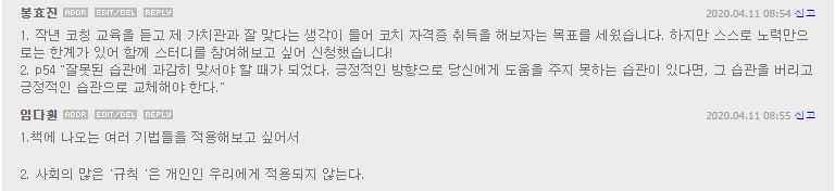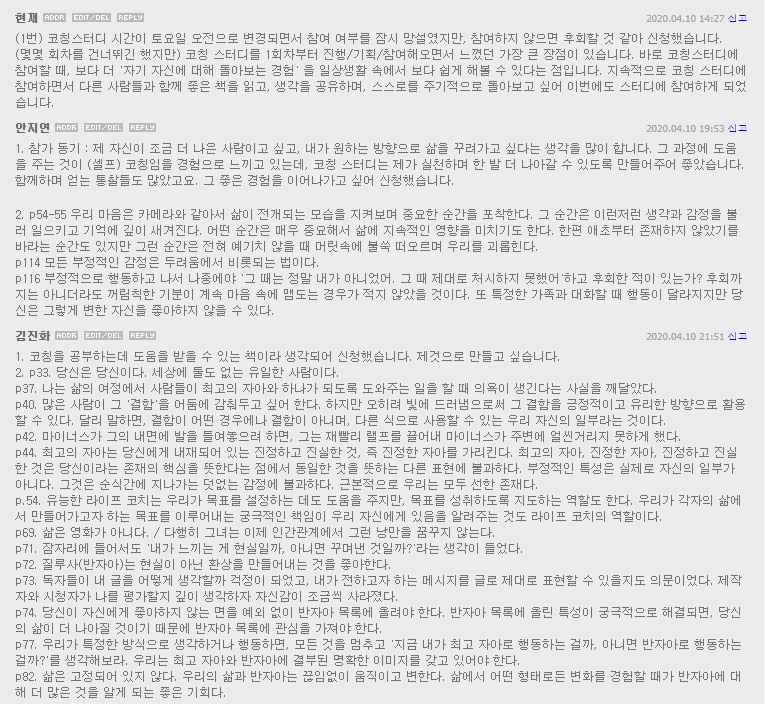 1) 이번 코칭스터디 11차에 참여하게 된 마음(동기)는 무엇인가요? ( 총 19명의 인원이 이번에 참여하게 되어서, 시간관리상 1주차에 늘 하던 체크인-참가동기 시간을 본 댓글에 적어서 공유하는 것으로 대신하겠습니다. ^^)