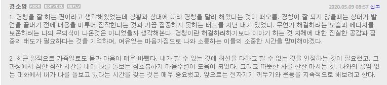 Q. p.241 쪽부터 소개된 '가치관 연습'을 한 후, 새롭게 알아차린 것은 무엇인가? 당신에게 울림을 주는 가치관은 무엇이었는가?