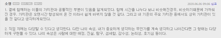 Q. p.241 쪽부터 소개된 '가치관 연습'을 한 후, 새롭게 알아차린 것은 무엇인가? 당신에게 울림을 주는 가치관은 무엇이었는가?