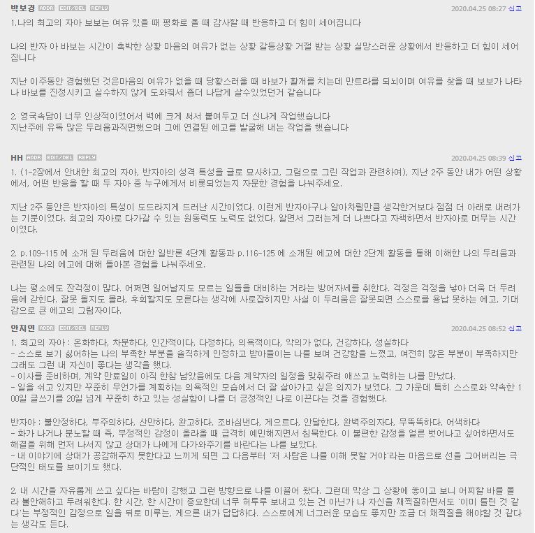 1. (1-2장에서 안내한 최고의 자아, 반자아의 성격 특성을 글로 묘사하고, 그림으로 그린 작업과 관련하여), 지난 2주 동안 내가 어떤 상황에서, 어떤 반응을 할 때 두 자아 중 누구에게서 비롯되었는지 자문한 경험을 나눠주세요.