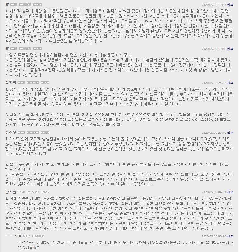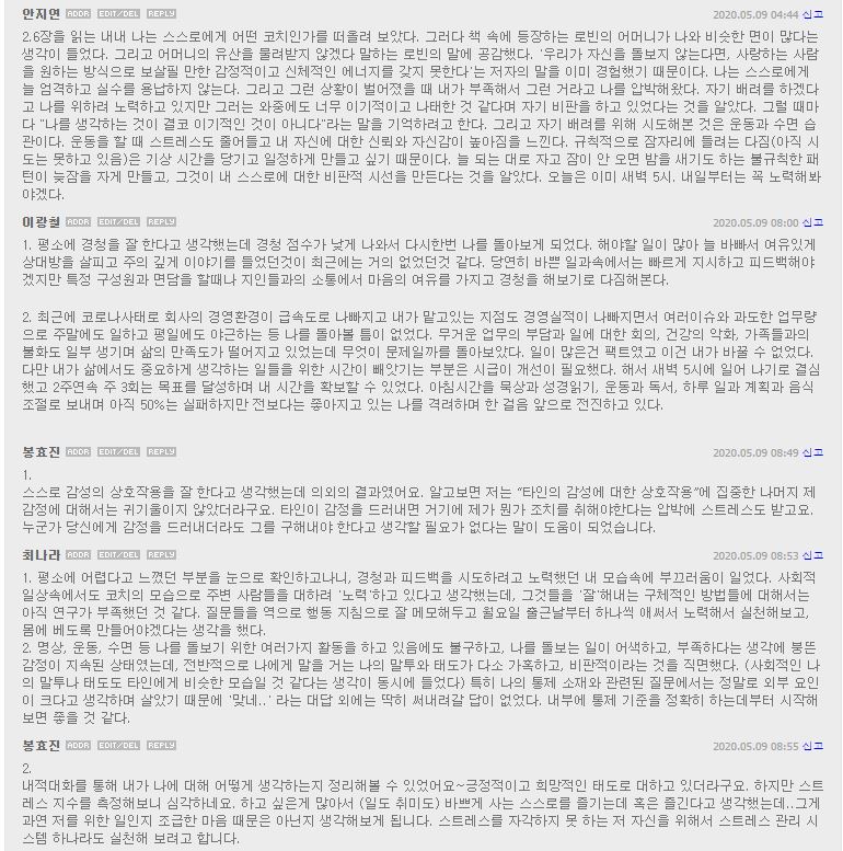 2. 6장에서 소개된 <내적대화(p.164-172)>를 한 후, 스스로에 대해 무엇을 깨달았으며, 자기 배려를 위해 무엇을 행동으로 옮겨보았는지 경험담을 들려주세요.