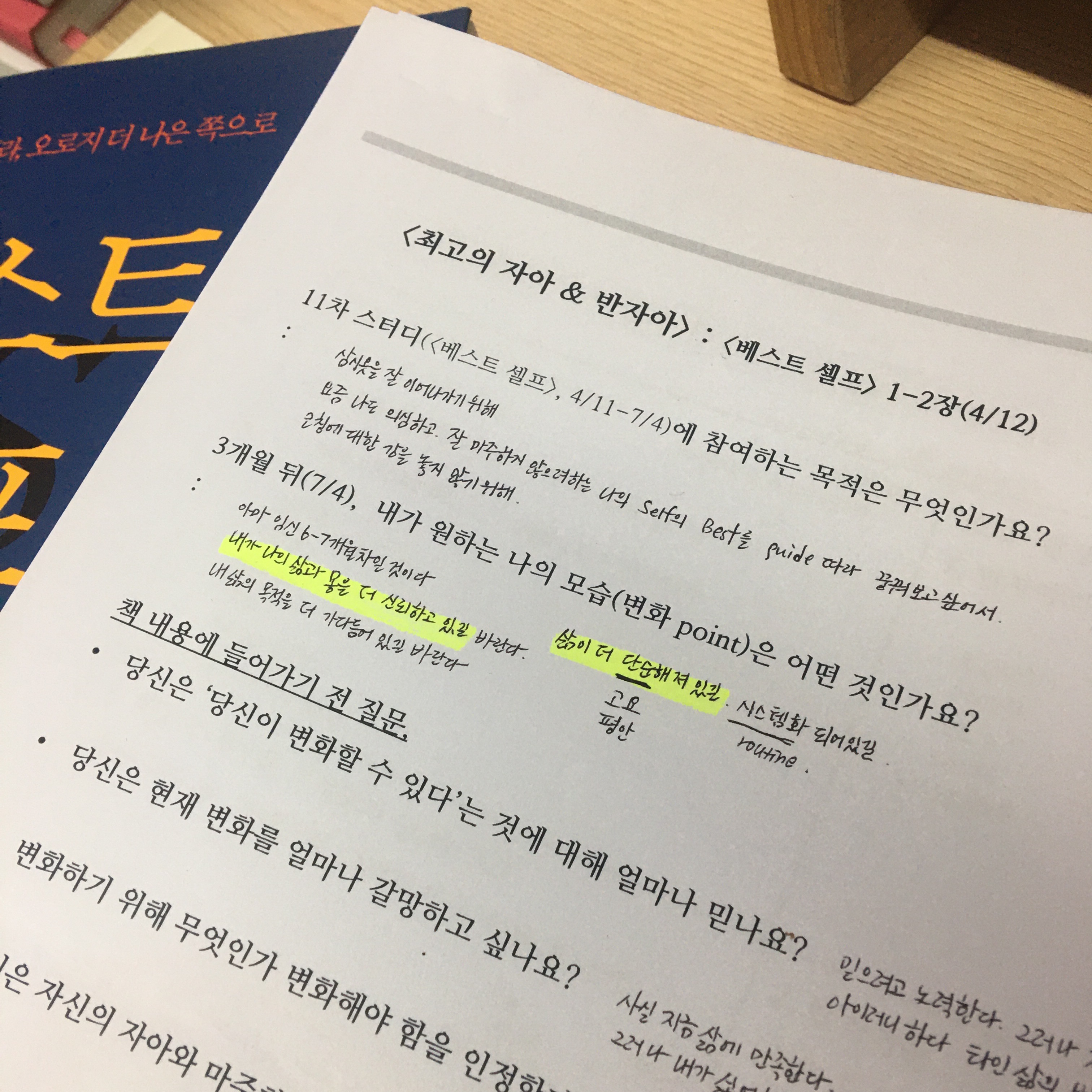 스터디를 진행하기도 하지만 나 역시 스터디 한 멤버이기도 하다. 이에 나 역시도 지난 3개월(4/11-7/4)라는 기간 동안 나 자신의 <베스트 셀프>를 찾아 나서는 여행을 했다. 그 여행을 때로는 내가 마주하고 싶지 않은 내 자신과 만나야 함에 고통스러웠고, 때로는 무언가 극복하고 앞으로 나아가며 강렬하게 변화하는 느낌에 희열에 가득찼었다. 지난 3개월을 돌아보고자 진행자로서 만들어서 나누어 드렸던 '보조자료' 출력물을 처음부터 끝까지 살폈다. 보조자료는 함께 하는 분들에게 도움이 되었음 하는 마음으로 만들기도 했지만, 궁극적으로 나도 이 책이 제시하는 모든 활동들에 오롯이 참여하고 싶은 마음도 있었기도 했다. 그렇게 나의 보조자료 출력물 첫 장을 보자마자, 나는 씨익 웃고 말았다. 4월 초 적어두었던 3개월 뒤 원하는 모습, 그러니까 7월 지금의 모습을 묘사한 문장이, 딱 지금의 나였으므로.