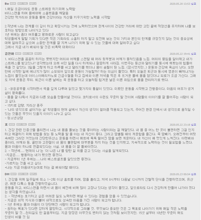 1. 7장. 건강 관련: 2주 동안, 단톡방에 3회 이상 건강 관련 인증샷(간단한 코멘트와 함께) 올리고, 바디스캔하며 깨달은 자신의 건강 현황과 그 이후 시도해본 건강을 위한 노력들에 대한 경험담을 나눠주세요. (따라서 이번 2주간은 고요했던 단톡방에 울림이 있을 예정이니 알람 Off부탁드리며, 인증샷 공유의 목적은 서로에게 '건강'에 대한 '알람'기능을 위함입니다.)