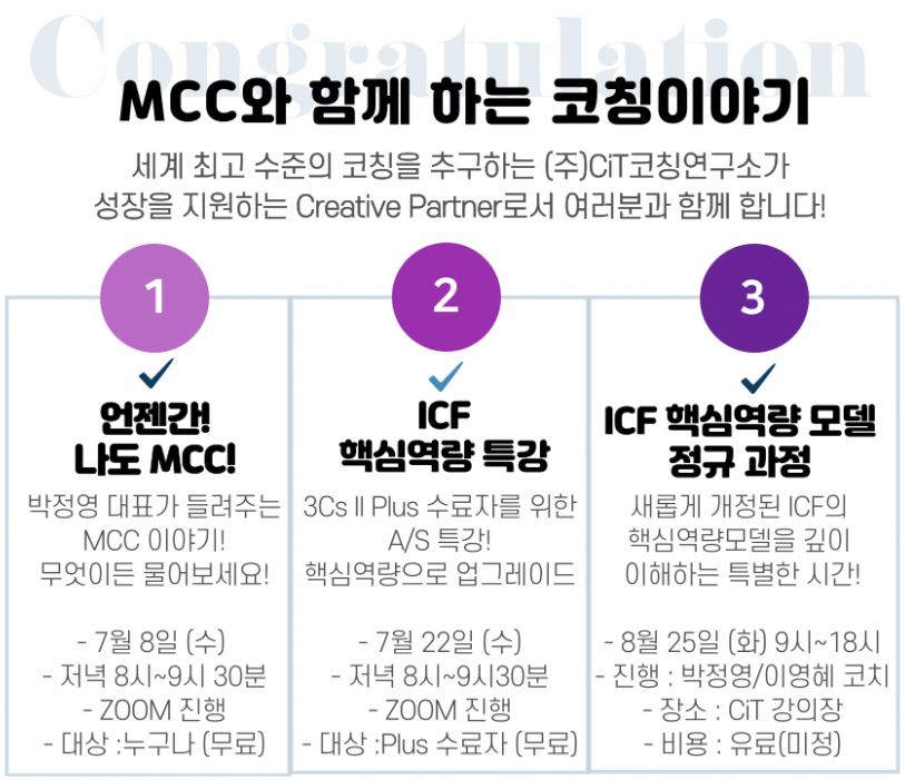최근 국내에도 MCC가 배출되고 있다. 박창규 코치님으로부터 시작해 최근 10명이 조금 넘어서고 있다고 들은 적 있다. 한국 코치로서 참 자랑스러운 일이 아닐 수 없다. 그 중 최근 #박정영 코치님의 MCC 취득 소식은 후배 코치로서 참으로 고무적인 일이 아닐 수 없었다. 아직도 생생히 기억나는 2010년 3Cs 첫 교육 때, 박정영 코치님이 밝혀주신 자신의 비전을 기억한다. 이 프로그램을 국제코치연맹의 인증프로그램으로 역수출하고 싶다고, 한국의 훌륭한 코칭프로그램을 전세계에 알리고 싶다는 그 비전 말이다. 결국 국내, 국제 모두 인증 프로그램으로 해 내시고, 이젠 MCC가 되셨다. 그녀의 비전과 그 비전을 이루어 가는 과정에서 배어나오는 감동이 퍽 크다. 그리고 코치님께서 어제 그 여정에 대해 풀어주시는 웨비나를 여셨고, 무언가 깊이 축복, 축하하는 마음으로 Zoom에 접속했다.