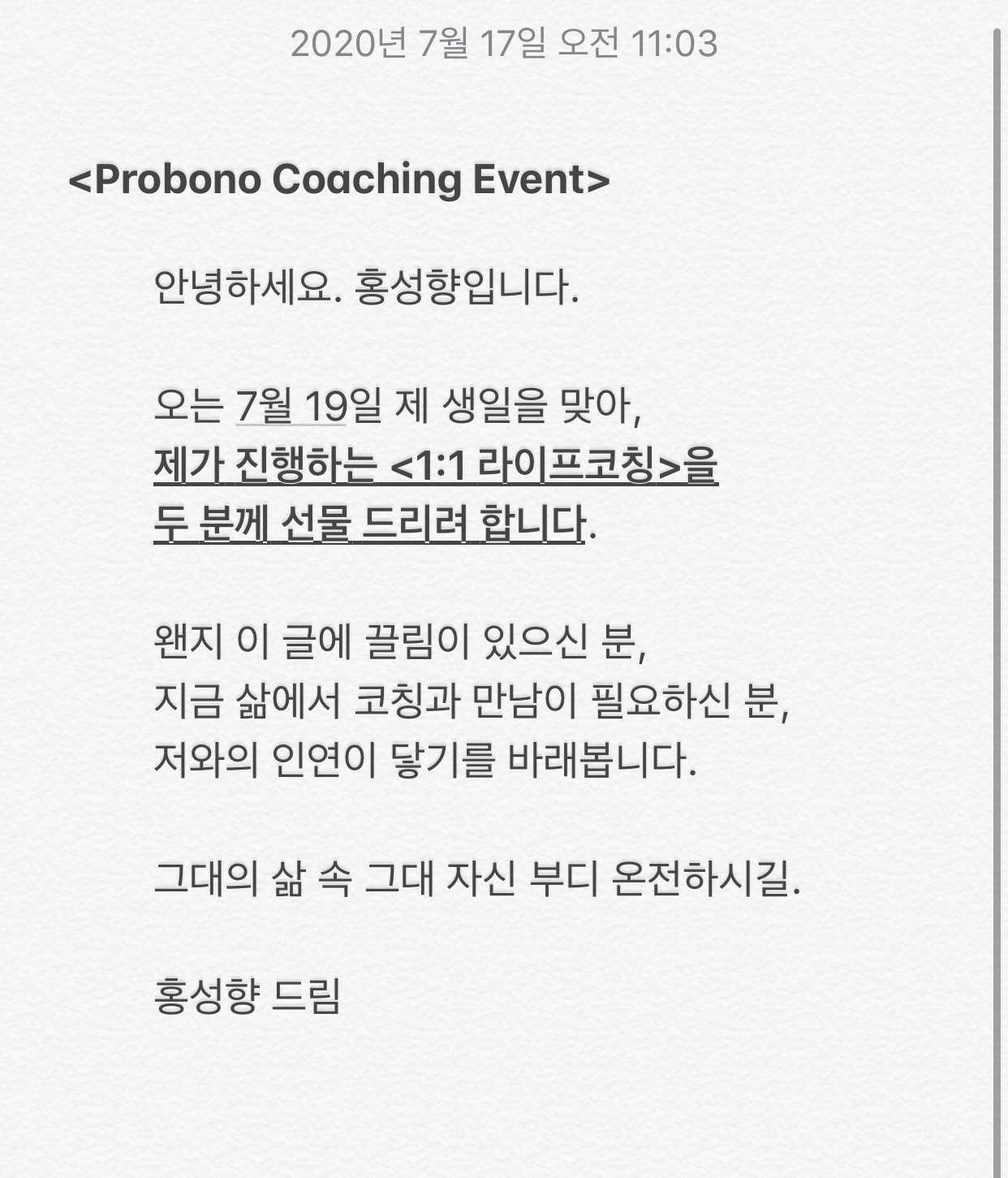 [모집완료 | 이벤트] 1:1 라이프 코칭(무료, Probono) 선착순 7 & 19번째 신청자 두 분께 드립니다.