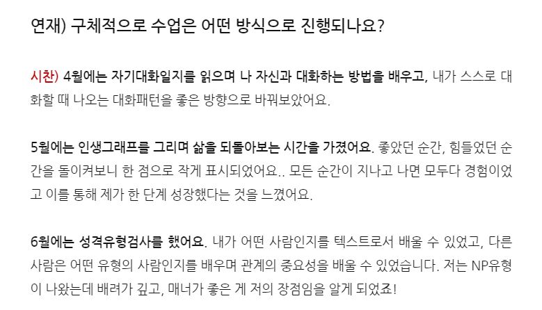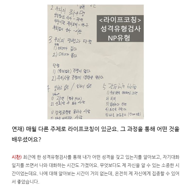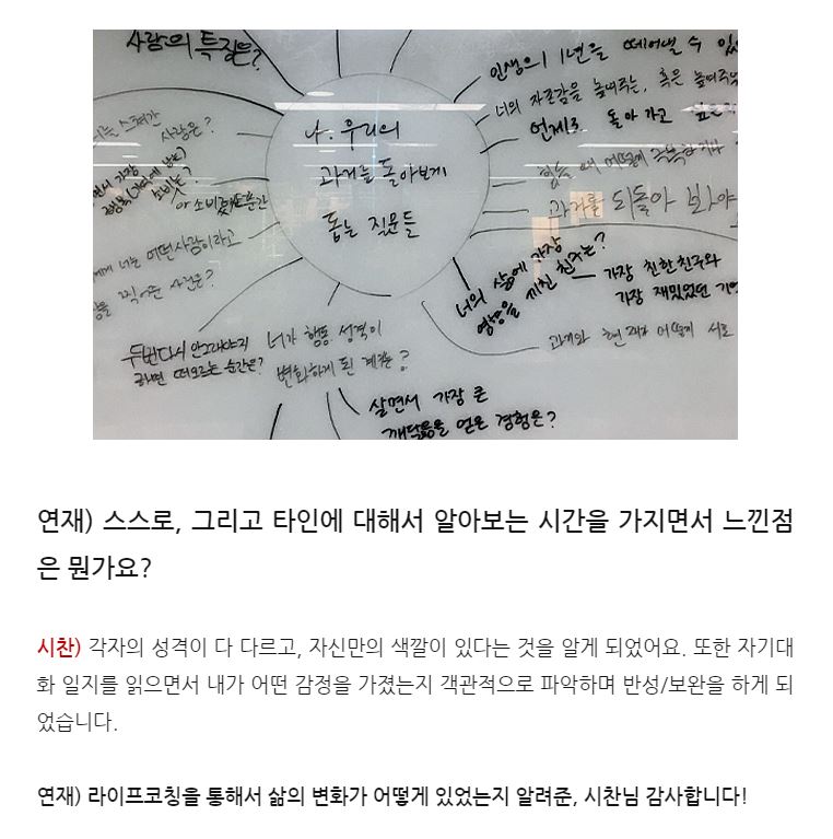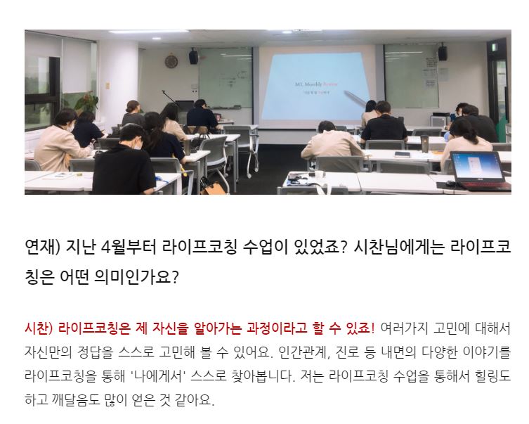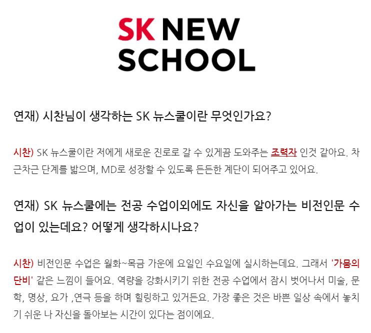 아이 예뻐라. 오늘 저녁에도 이어진 <SK뉴스쿨> 친구들과의 1:1 라이프코칭을 하다 들은 소식. 제가 진행한 <라이프코칭> 과목에 대해서 스스로 인터뷰 기사를 만들어 보았다는 소식이었습니다. 링크를 타고 들어갔더니 이렇게도 어여쁘게 적어주었다니, 지난 몇 개월 동안 MD학과, 정보보안학과 친구들과 정든 시간들이 떠오릅니다. 그 때는 제 최선이었겠지만, 그래도 더 잘해줄걸, 더 많이 알려줄걸하는 마음이 듭니다. 우리 남은 심화과정도 잘해보아요. :-) 고마워요. (feat. 연재 & 시찬씨)