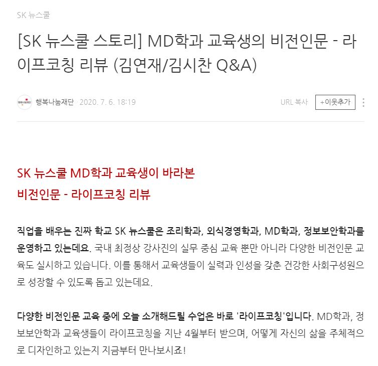 [강의후기] 행복나눔재단 <SK뉴스쿨(2020-01 ~ 2020-07)> 라이프코칭 과목 강사 및 담당 라이프코치 + 교육생들의 리뷰