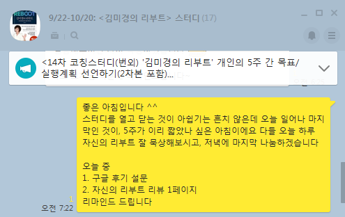 리부트라는 책을 계기로 코치로서 새로운 도약을 하는데 아이디어를 얻고싶다는 생각이있었어요. 특히 리부트는 읽다 만 책이어서 함께 읽는다면 더 좋겠다 싶었구요.