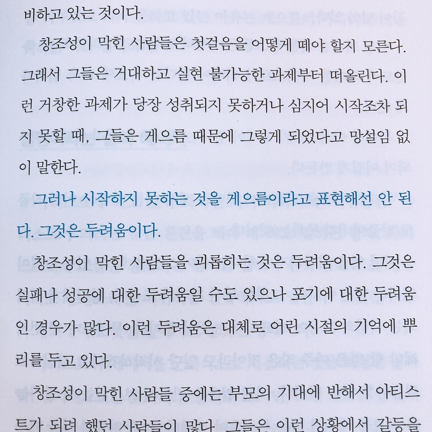 - 그러나 시작하지 못하는 것을 게으름이라고 표현해선 안 된다. 그것은 두려움이다. (259)