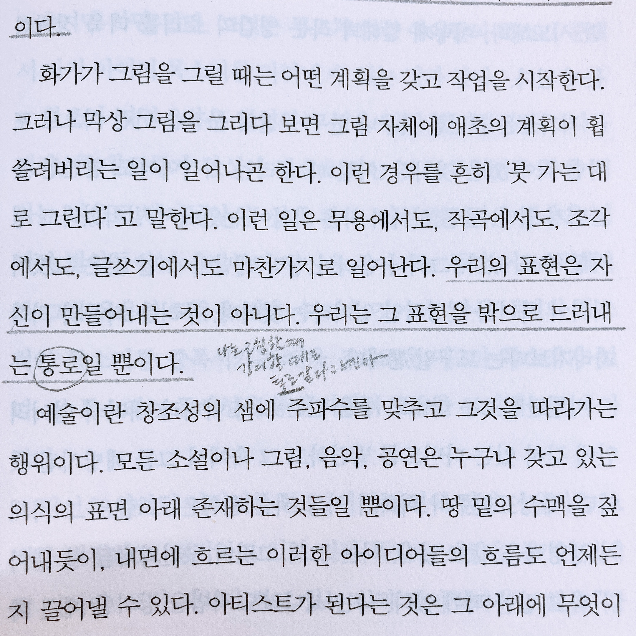 우리의 표현은 자신이 만들어내는 것이 아니다. 우리는 그 표현을 밖으로 드러내는 통로일 뿐이다. (p.209)
