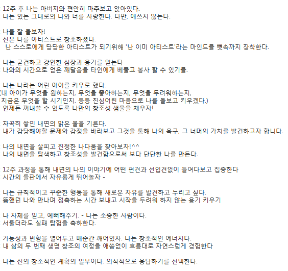 이렇게 코치들을 대상으로 스터디를 오픈하고 닫고 하며 여러 경험을 합니다. 그 중에서도 #아티스트웨이 처럼 긴 스터디에서의 여운은 다른 스터디와는 또 다르지요. 각자 지향했던 창조성 문장을 다시 읽어보며 결국 그것에 조금씩 다가갔던 멤버들을 마음에 품어봅니다.