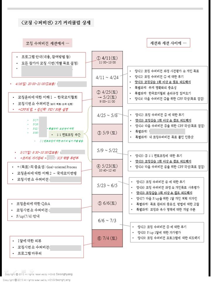 - **본 코칭수퍼비전을 이수한 분은 홍성향 코치가 운영하는 삼시옷 멤버십 상/하반기에 참여할 수 있다.