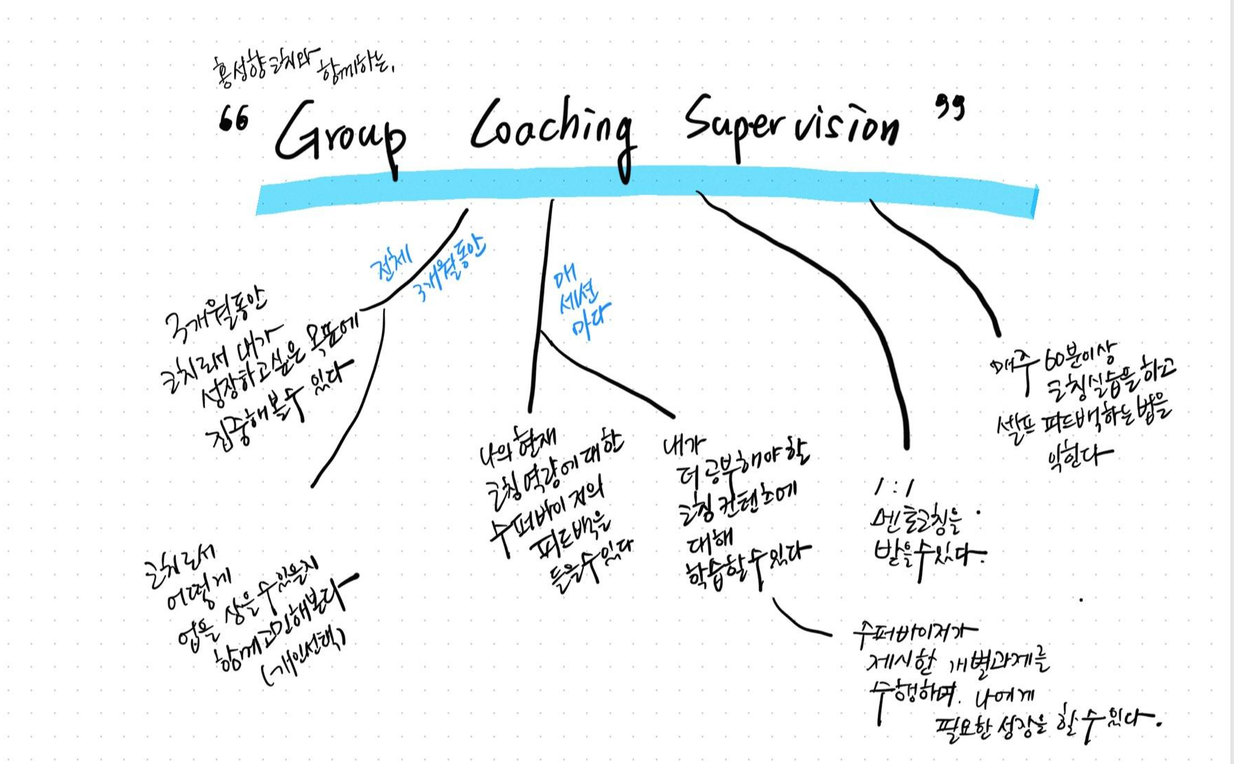 - [코칭 수퍼비전 본 세션 중에는] 1:1 멘토코칭 주간이 있어 수퍼바이저에게 1:1로 코칭 받고, 한 개인으로 이슈를 다루는 동시에, 코치로서 학습하고 토론할 점에 대해 도출할 수 있다.