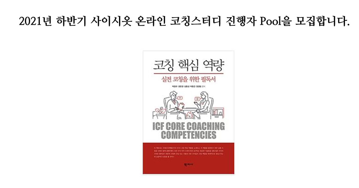 - 2021년 하반기 사이시옷 온라인 코칭스터디에서 다룰 책: <코칭 핵심 역량: 실전 코칭을 위한 필독서(2019)>