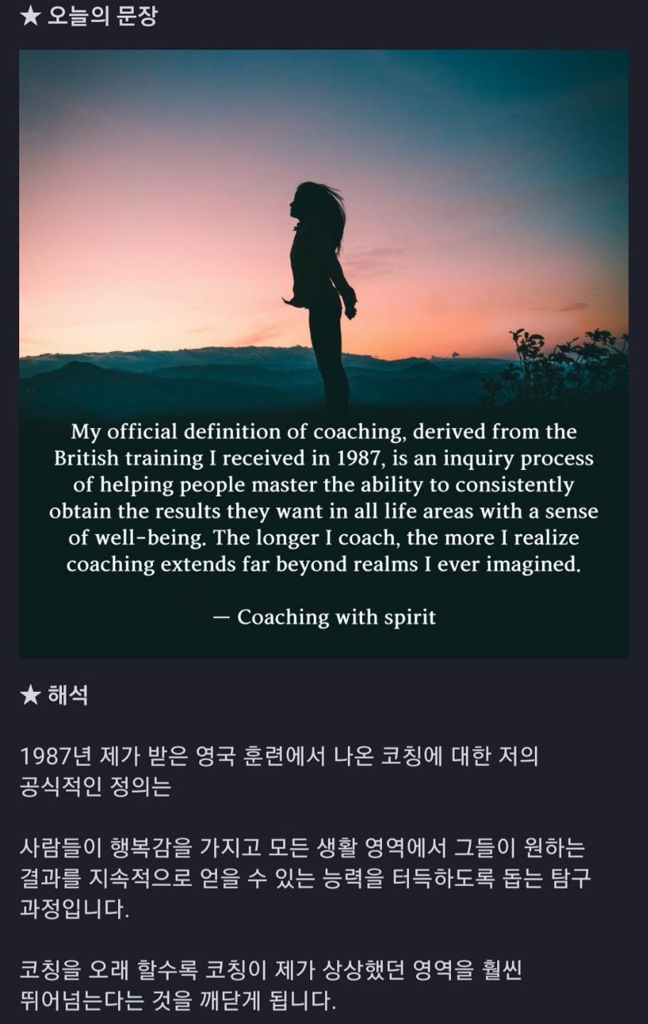 아, 여기까지 읽으시면서도 막 끌리신다고요? 그런데 영어에 대한 두려움이 있으시다고요? 괜찮아요. 하실 수 있는 만큼 참여하심 되니까요. 일단 저 개인적으로는 매일 영어책을 펼치는 것 자체를 습관으로 들일 수 있는 것, 이왕이면 책을 읽는데 그게 코칭 전문 컨텐츠이어서 코칭 공부도 된다는 것에 뜻을 두려 합니다. 어찌 모든 문장을 제가 다 완벽하게 이해하겠어요. 그래서 책 펴 놓고, 네이버 영어사전 딱 펴놓고 모르는 단어 검색도 해 보고, 제가 우리말로 코칭할 때 자주 쓰는 코칭 질문, 코멘트들에 해당하는 영어 문장 몇 개 정도만 입에 암기해 보자. 이 정도 목표로 가져가 보려고요. 어때요, 같이 안 해 보실래요 ^^?