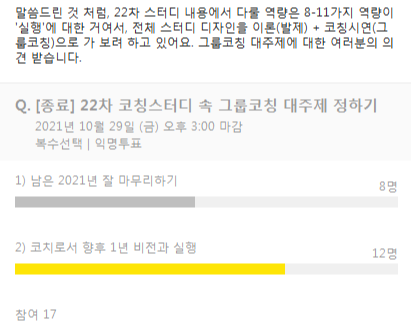 21차 마무리할 때 말씀드렸던 것처럼, '그룹코칭'을 접목해서 가져가보려 합니다.