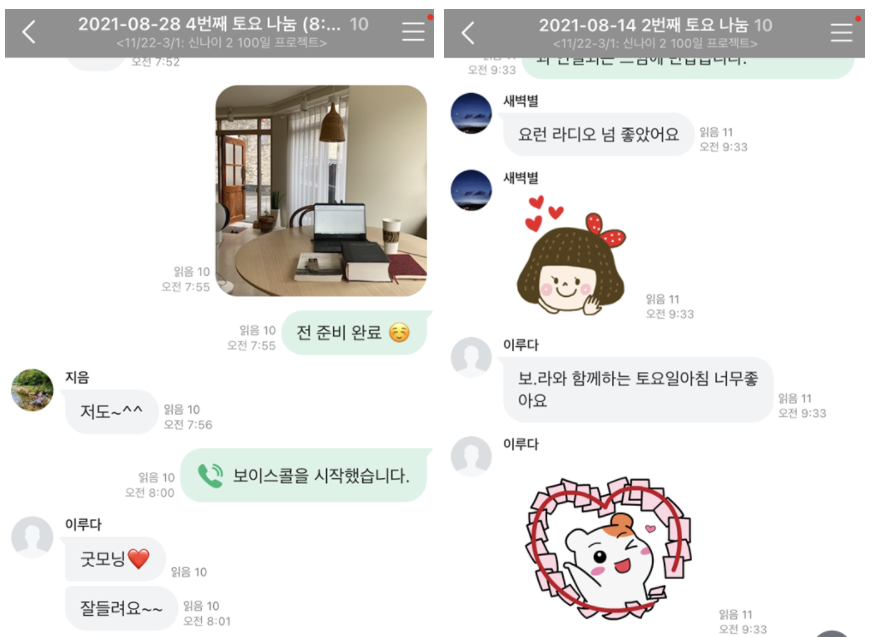 지난 방학 잘 보내셨나요? 내일 신나이2 시작을 앞두고, 지난 100일을 돌아보는 오전을 보냈습니다. 지난 100일을 통해 누군가와 토요일 아침을 정기적으로 함께 한다는 기쁨, 그 힘을 경험할 수 있어서 정말 'Goood Morning'으로 열 수 있었고, 개인적으로는 음성으로만 하는 '보이스톡'이 즐겁구나란 것도 알게 되었어요.