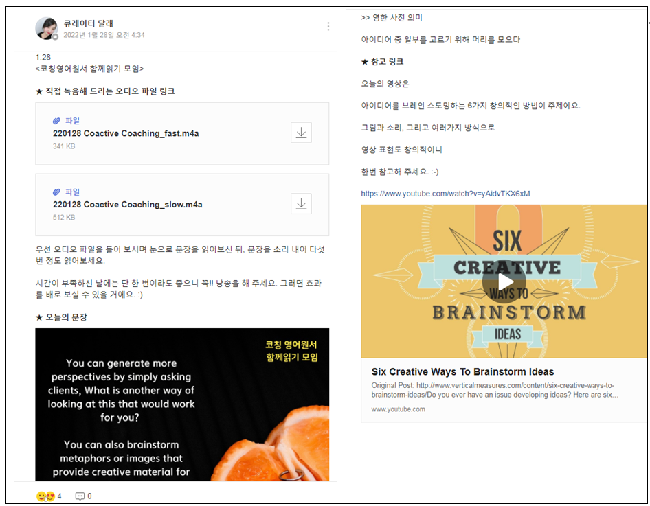 1) 달래님과 함께 하는 쉐도잉 클라스(월 1회): 문장 몇 줄을 집중적으로 발음교정해보는 시간.