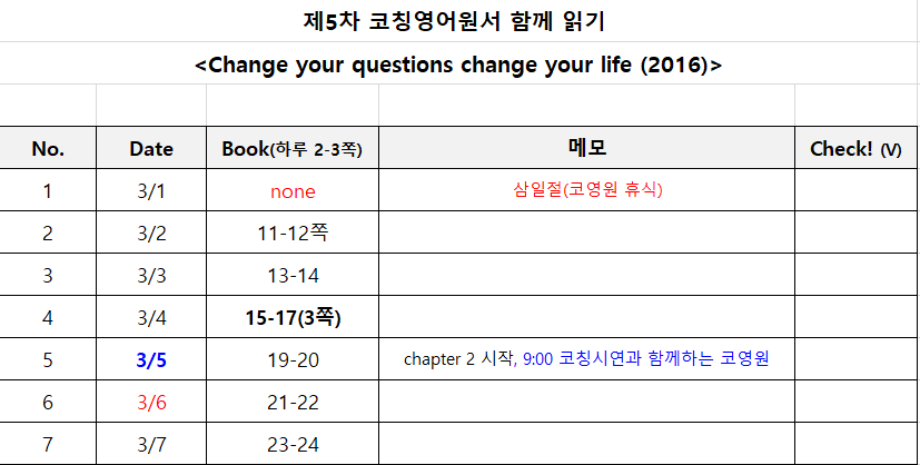 : 'change your questions change your life'책은 우리말 번역서로 먼저 제가 읽었던 책인데요. 한 직장인이 한 전문코치를 만나 일어나는 소설(fiction)형식의 책으로, 코칭에서의 질문의 힘이 여실히 잘 드러나는 재미난 책이에요. 우리가 coaching question, co-active coaching까지 이론서 중심으로 슥 읽어왔으니까 조금 말랑하게, fiction형식으로 적힌 코칭 이야기 같이 읽어볼까요? fiction 속 코치가 던지는 실질적인 코칭대화의 영어 ver도 익히는 재미가 솔솔할거에요. 코칭이란 전체 장기 프로세스 안에서 고객의 변화를 원서로 읽는 재미도요. 무엇보다도 그 앞 전 두 책보다 활자 크기도 크고, 책이 자그마해서 2페이지 하니까 양이 훨 수월할 것 같아요. 찡긋. 우리 봄에도 화이팅!
