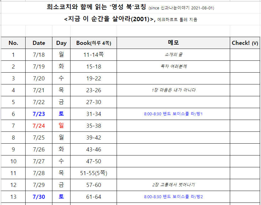 1) 희소 코치가 제공하는 '78일간 함께 읽는 읽기 진도표'에 따라 매일 4페이지씩 책 내용을 읽습니다. (물론 진도표 속 진도 속도로부터 자유로우셔도 ok입니다, 다만 토요 라방은 진도표에 맞추어 진행됩니다)