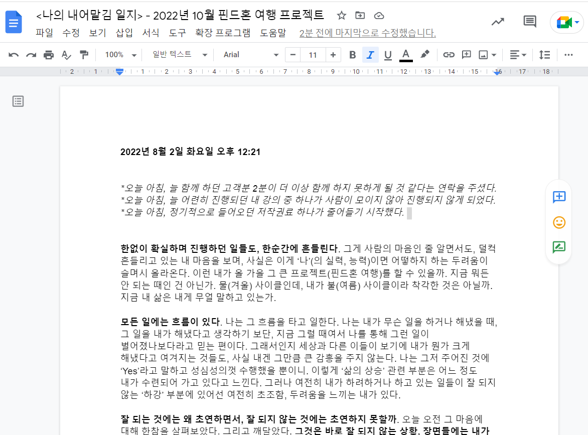- 연재드릴 글 내용은 전체 흐름 기준으로 '윤문'되지 않고, 그 날의 통찰 기준으로 작성하게 됩니다. 후에 에세이 책으로 작성할 땐 전체 원고 내용의 순서와 흐름을 통일성있게 가져가려 해요. 즉, 그 날 그 글은 그 날의 흐름이 담겨 있습니다. (이번 12월에 나눠드리게 될 소책자는 이 날 것 그대로의 글들을 순차적으로 모은 것을 드리게 될 거에요. 책 자체로 편집하는 것은 2023년 상반기에 출판사와 함께 계약하여 진행하려 합니다.)