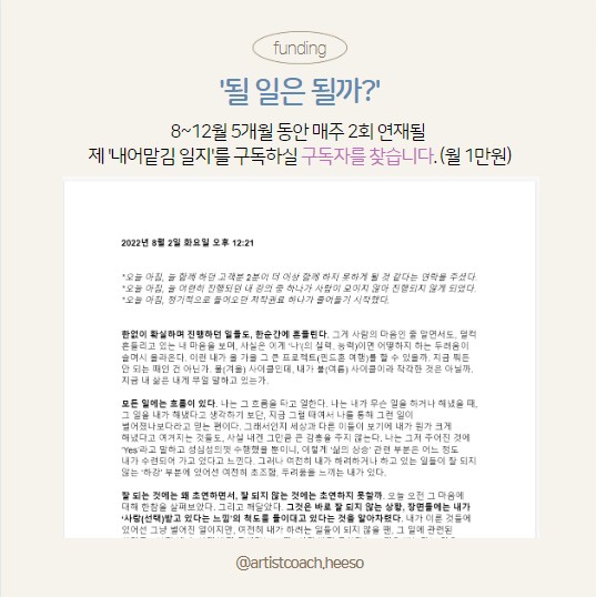 - 프로젝트 명: 희소 코치의 '될 일은 될까: 내어맡김 실험일지' 연재