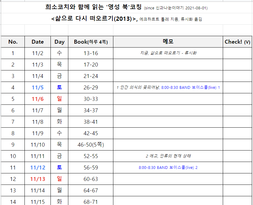 1) 희소 코치가 제공하는 '92일간 함께 읽는 읽기 진도표'에 따라 매일 4페이지씩 책 내용을 읽습니다. (물론 진도표 속 진도 속도로부터 자유로우셔도 ok입니다, 다만 토요 라방은 진도표에 맞추어 진행됩니다)
