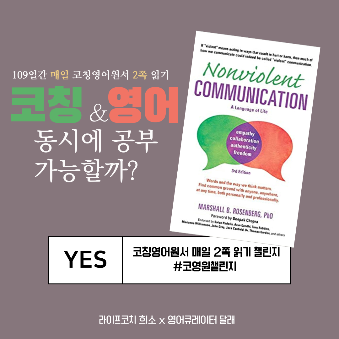 코치로서 누군가와 소통하는 기본 역량을 키우기에 적합한 도서라 생각합니다. 특히 영어 표현으로 감정과 욕구를 헤아려주고, 그에 대한 질문을 나눌 수 있다는 것에 메리트가 있다고 판단했어요. 우리가 영어로 자신의 마음과 욕구를 표현할 수 잇을 때 기본적인 영어 소통 뿐 아니라, 코치로서 고객의 주제를 터치할 수 있는 힘도 기를 수 있다고 생각합니다. 우리 함께 이 책 재밌게 읽어보아요!