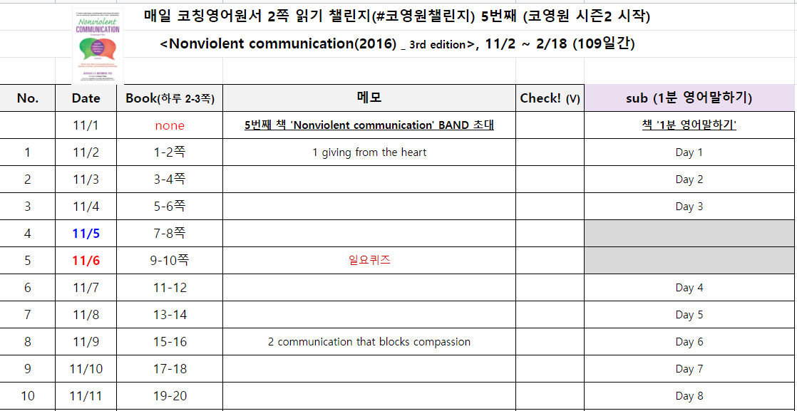 3. [서브 프로젝트(참여자 선택)] 책 <1분 영어 말하기> 역시 진도표에 진도를 기입하고, 채팅방에서 원하시는 분끼리 나눔. (영어 말하기도 일요퀴즈 해볼까요 ㅎ 나중에 여쭙어볼게요)