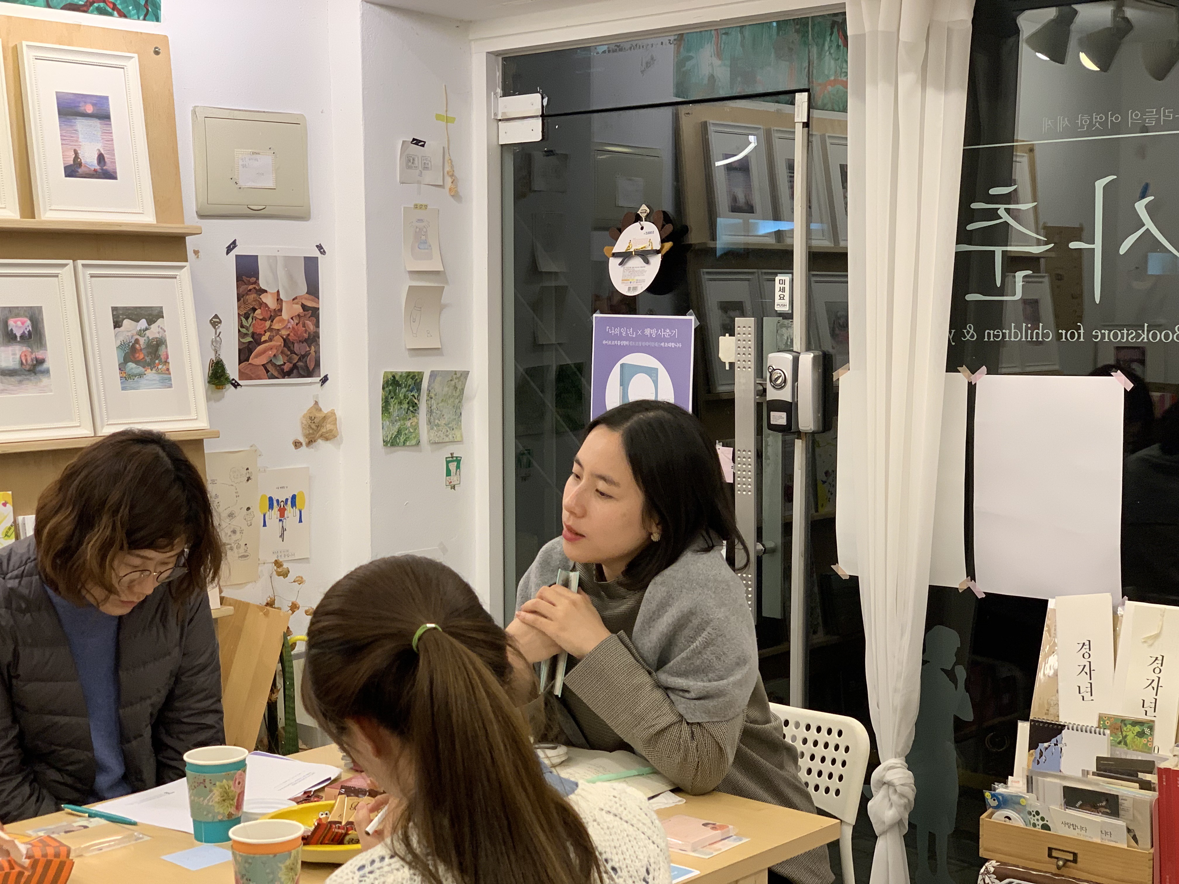 그러나, <책방사춘기>에 도착한 순간 그 공간 고유의 밝음, 따스한 에너지에 반했습니다. 책방 주인선생님의 취향이 가득 배어나는 공간에 몇 분 머물자마자 추위는 잊고서, 그 곳에서 뵙게 된 분들이 한 분 한 분 눈에 들어오기 시작했습니다.