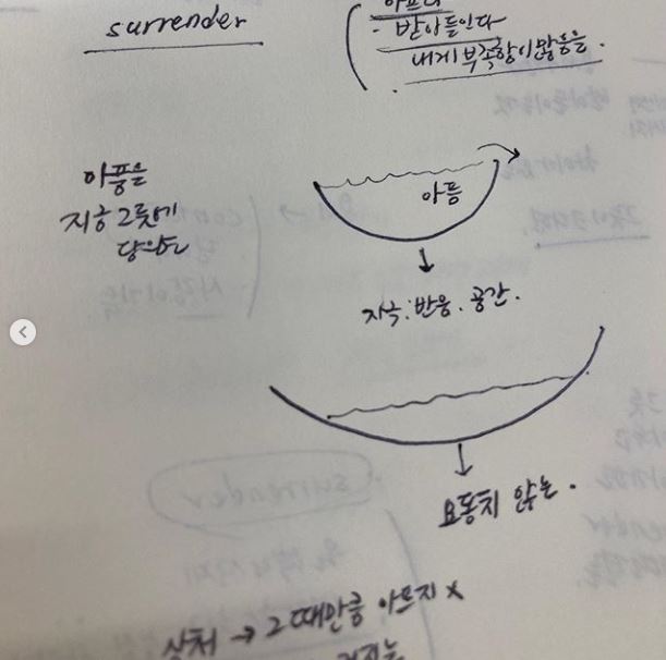 - 그것이 surrender와 어떻게 연결되는가? : 이 아픔을 받아들이는 것. 이런 장면이 찾아온 까닭을 이해하고, 잘 받아들여 영적 성숙을 하는 것. surrender 한다는 것은 곧 내 삶을 내가 설계하지 않는다는 것 같다.