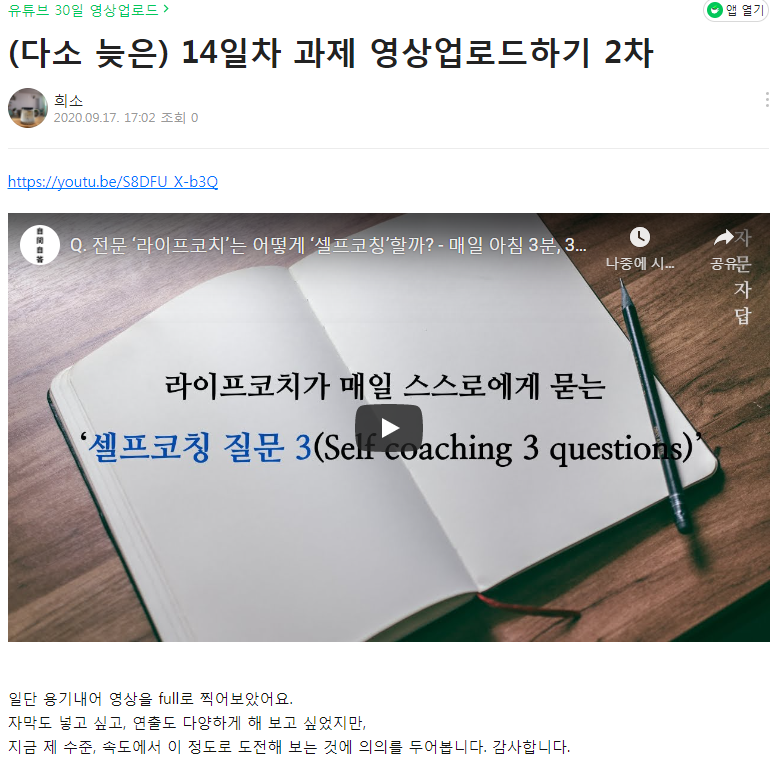 - 14일차 과제: 영상업로드하기 (2차) 일요일 24:00 전까지 30일 과제 게시판에 올리기