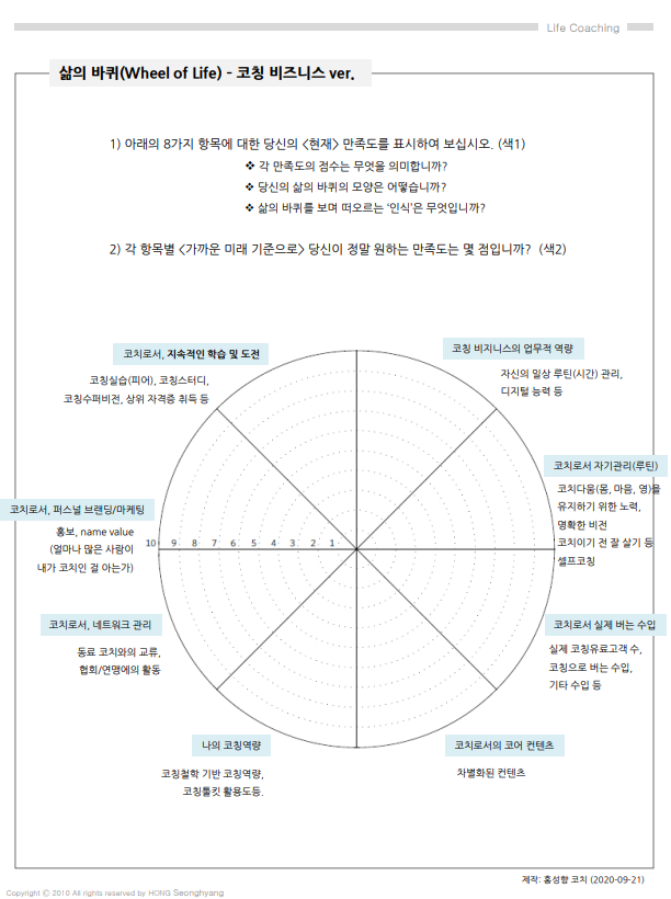내일 시작될 코칭스터디를 앞두고, 동료 코치분들과 나누고 싶은 마음에, 우리 코칭비지니스를 각자 점검해 볼 수 있는 '라이프밸런스 휠'을 만들었다. 각자의 코칭비지니스 현황을 체크하고 내일 만나기로 한 이 밤. 나부터 스스로에게 묻는다. 나는 어느 영역을 더 확실히 리부트 해야 하여야 하는가. 이제 행동해야 할 때이다. (물론 늘 행동해 왔지만, 더 전략적으로 말이다.)
