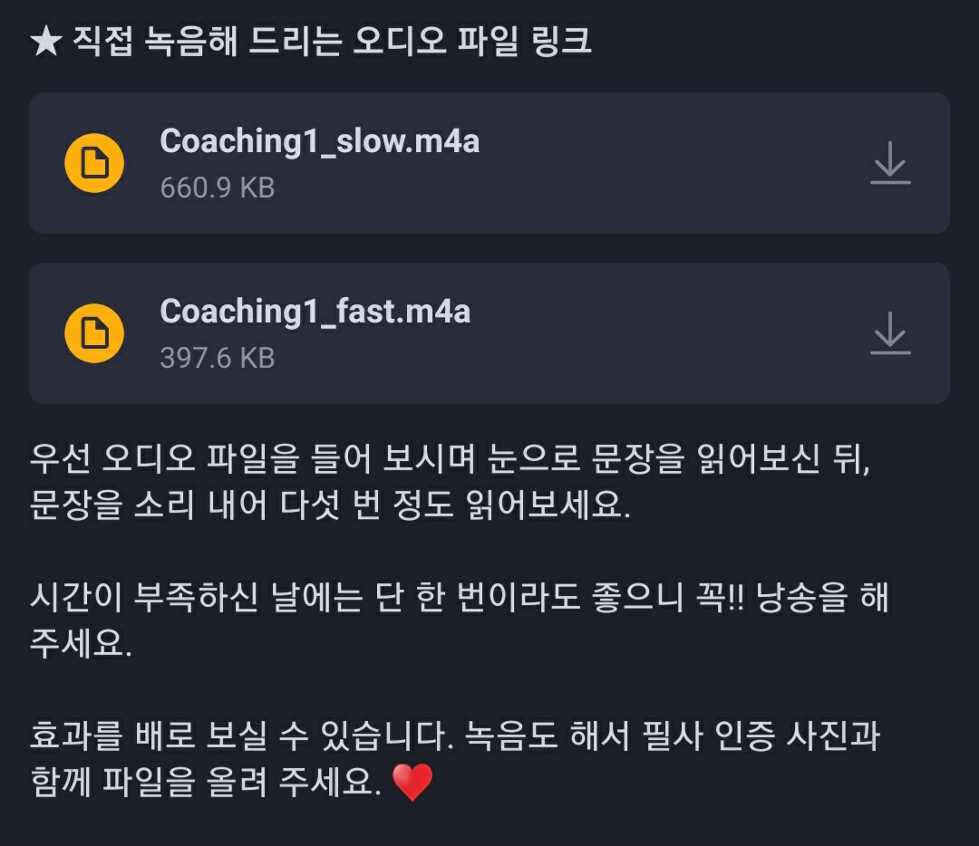 - 달래님이 올려주시는 녹음파일의 문장을 암기하고, 그 발음을 그대로 따라서 익히려고 노력해봅니다.